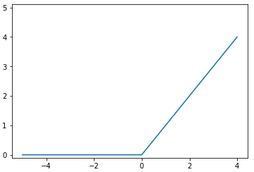 이 ReLU 함수는 입력이 0을 넘으면 입력을 그대로 출력하고 0 이하면 0을 출력하게 된다.