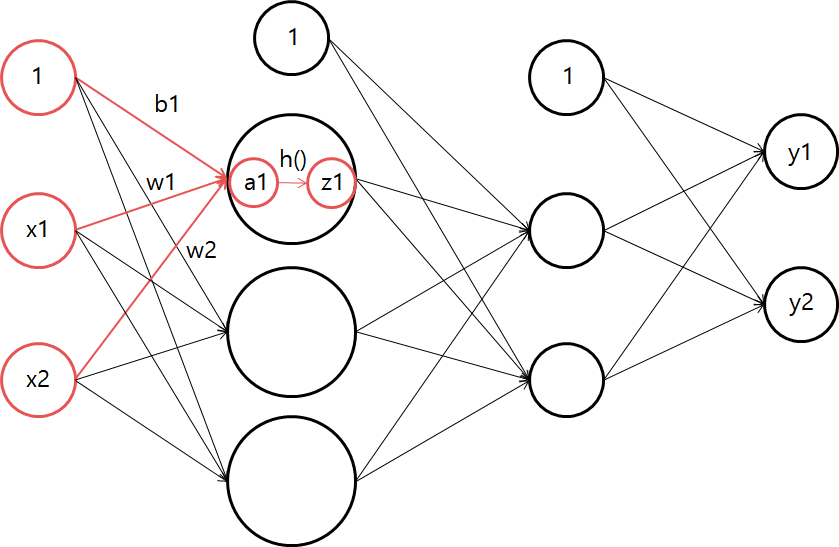이때 우리는 활성함수를 배웠는데 그 중, 시그모이드 함수(h())를 이용하여 출력값이 활성함수를 거치도록 해주고(z1)그 값을 다시 입력값으로 다음 층으로 전달시킨다.