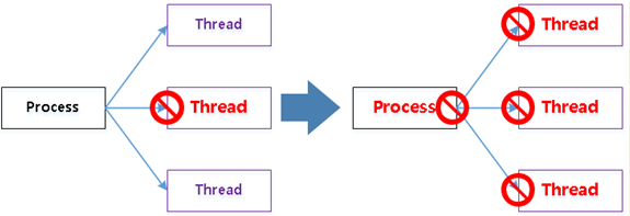 하지만 멀티 스레드 구조에서 자식 스레드중 하나에 문제가 생긴 경우에는 전체 프로세스가 영향을 받게 된다.(ex : thread I/O)