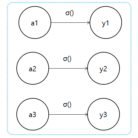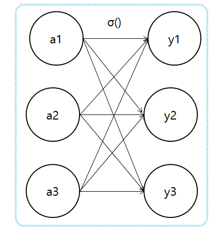 이 소프트맥수 함수를 그림으로 나타내면 다음과 같다. 그림과 같이 소프트맥스의 출력은 모든 입력 신호로부터 화살표를 받는다.