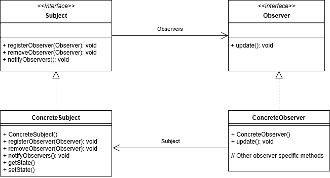 주제가 옵저버에 대해서 아는 것은 옵저버가 특정 인터페이스(Observer 인터페이스)를 구현 한다는 것 뿐.