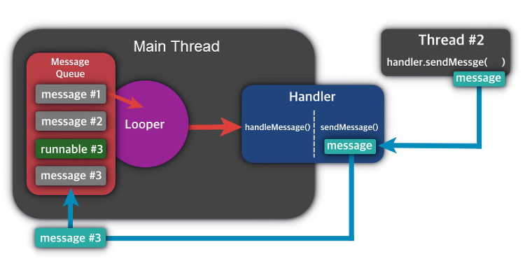 이때 Message Queue는 자기 자신 혹은 다른 스레드로 부터 받은 Message이나 Runnable 객체를 순서대로 꺼내 Handler가 처리하도록 전달한다.