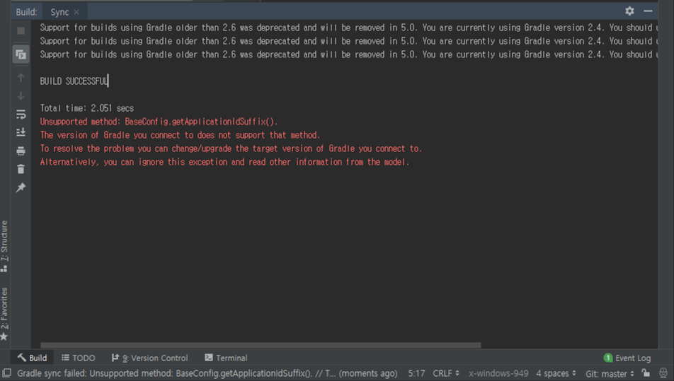 gradle-2.2.1-all.zip -> gradle-4.1-all.zip 으로 변경해주고 재빌드를 해줍니다.