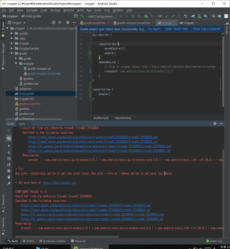 그리고 나면 또 아래와 같은 에러가 뜰텐데 build.gradle의 repositories에 jcenter()을 넣어줍니다.