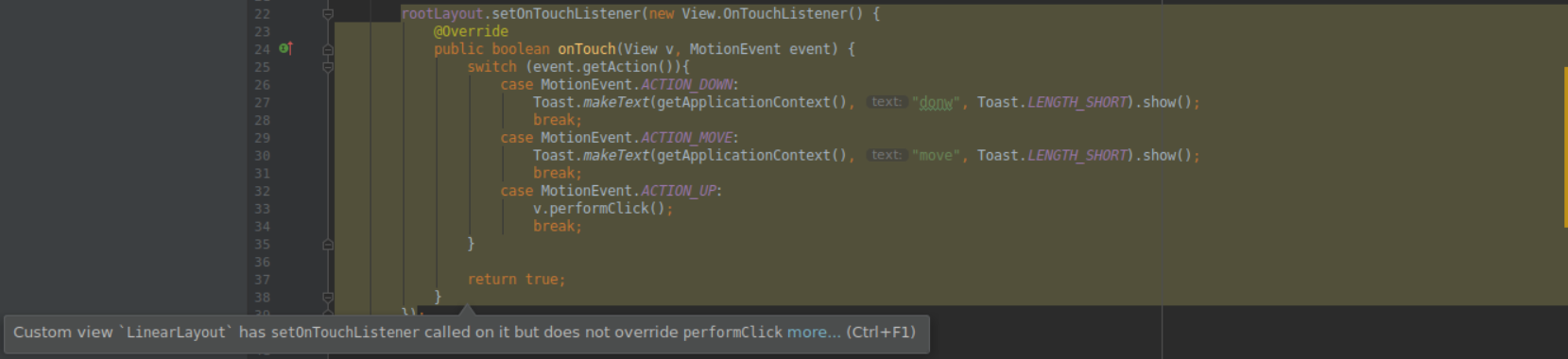 Custom view `LinearLayout` has setOnTouchListener called on it but does not override performClick less... (Ctrl+F1)