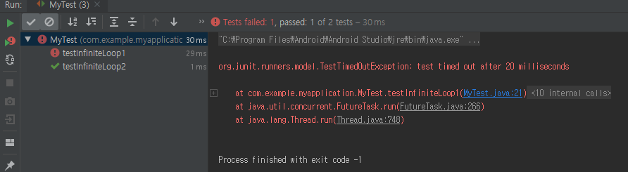 - 하나의 테스트가 통과하기 위한 timeout 설정할 수 있다. (vs @Timeout)