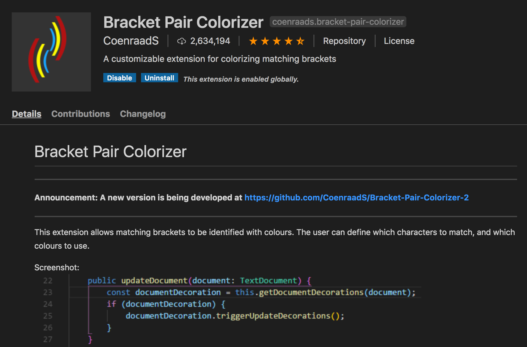 Visual Studio Marketplace 링크: https://marketplace.visualstudio.com/items?itemName=CoenraadS.bracket-pair-colorizer