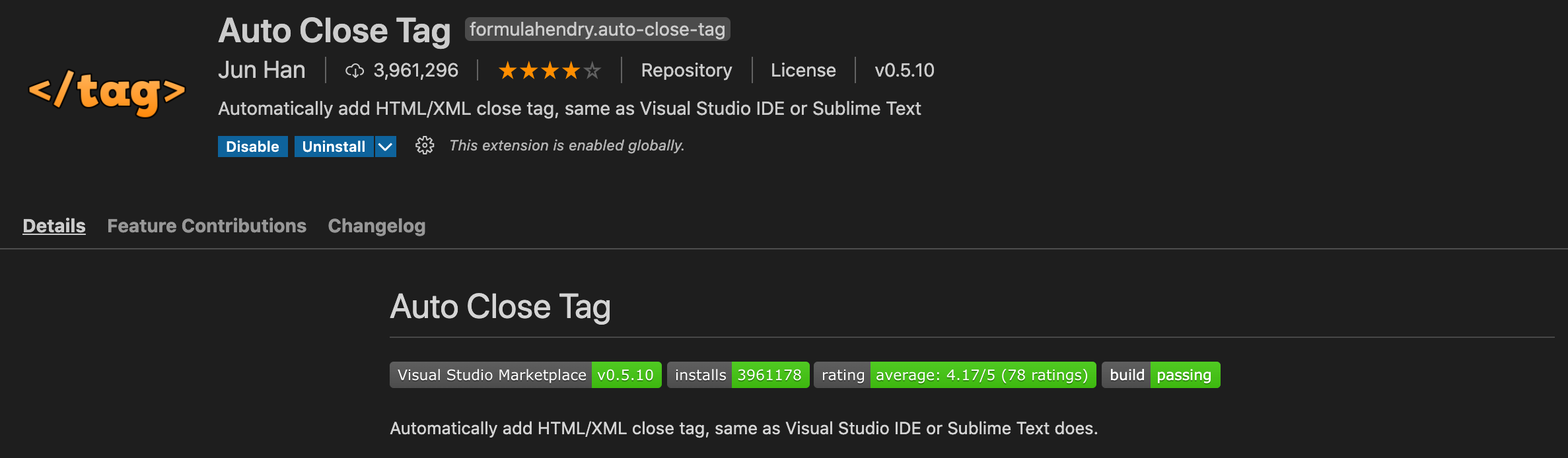 VS Code 1.16버전부터 HTML, Handbars등의 태그 자동 닫기를 지원해주긴 하나 XML, PHP, Vue, JavaScript, JSX등은 지원하지 않기 때문에 이 플러그인을 설치하고 사용하면 좋습니다.