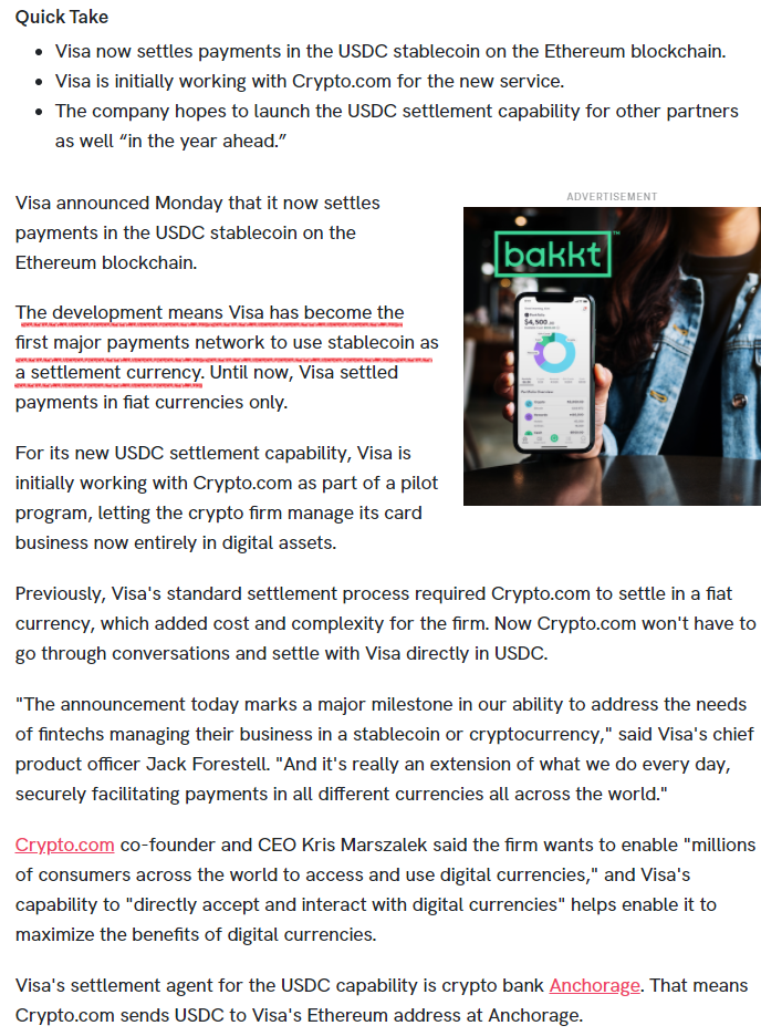 Visa now settles payments in the USDC stablecoin on the Ethereum blockchain. Visa's settlement agent for the USDC capability is Anchorage.