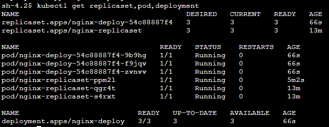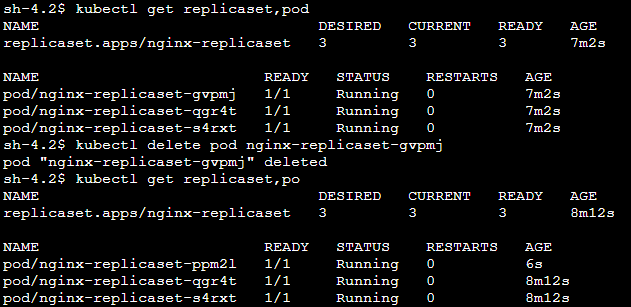 즉, replicaset로 만들어진 pod 이름을 delete하여 current와 ready가 2개가 되었다가 다시 3개가 됨을 알 수 있다.