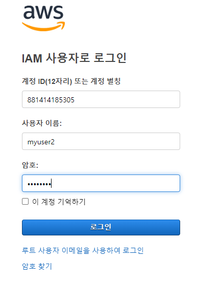 이제 로그아웃 후 IAM 사용자로 로그인을 클릭하여
