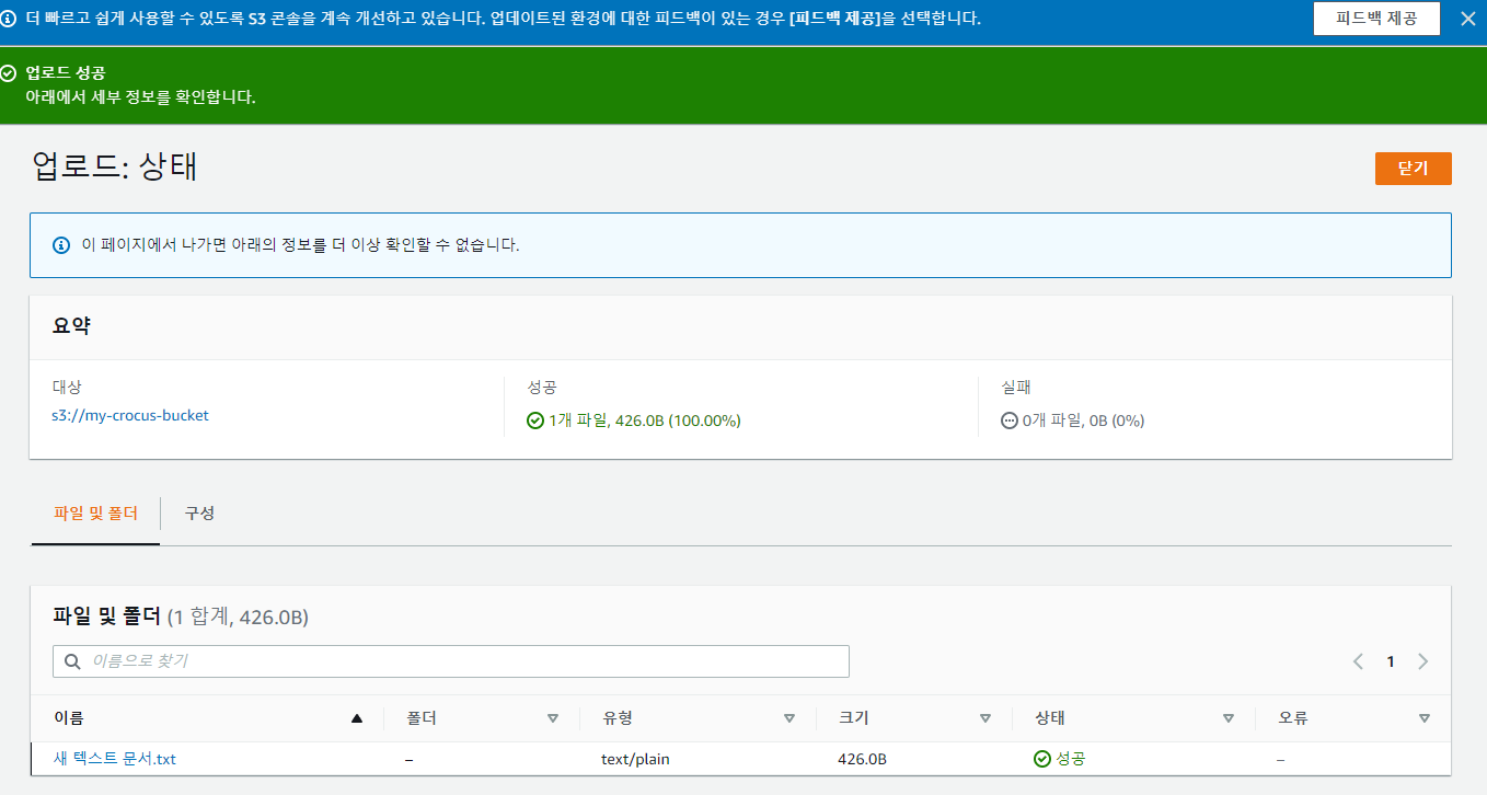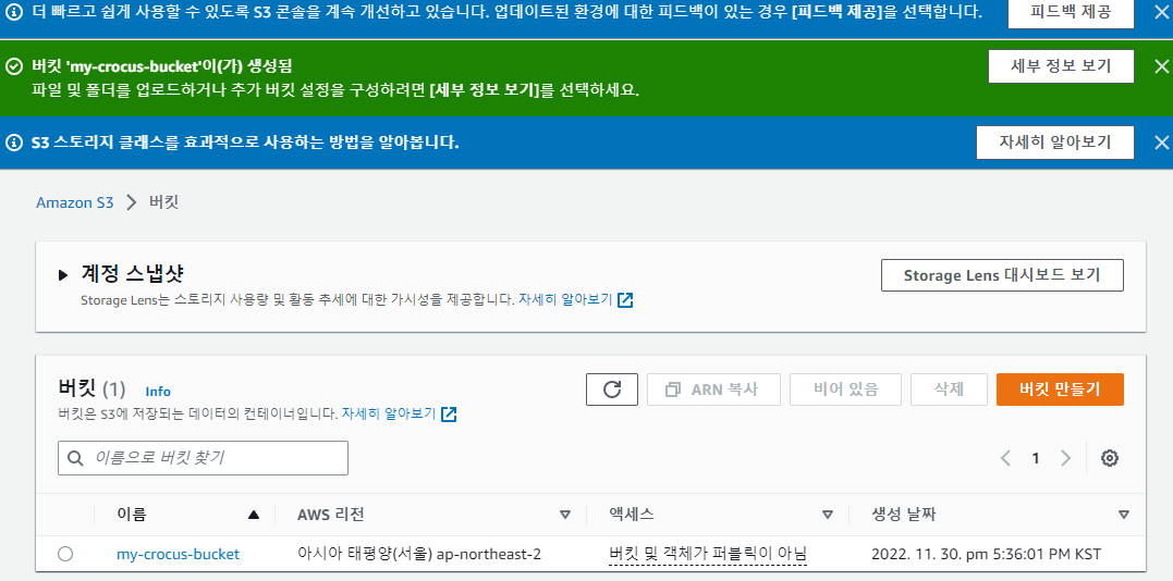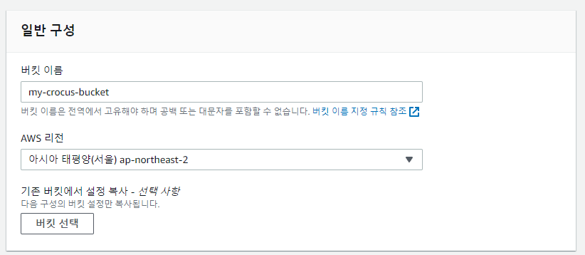 버킷 이름 : my-crocus-bucket (✔ 버킷은 전세계에서 유일해야하기에 본인이 원하는 이름으로 지정)