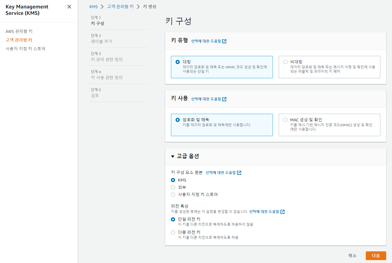 아래와 같이 KMS에서 CMK를 생성할 것이다.