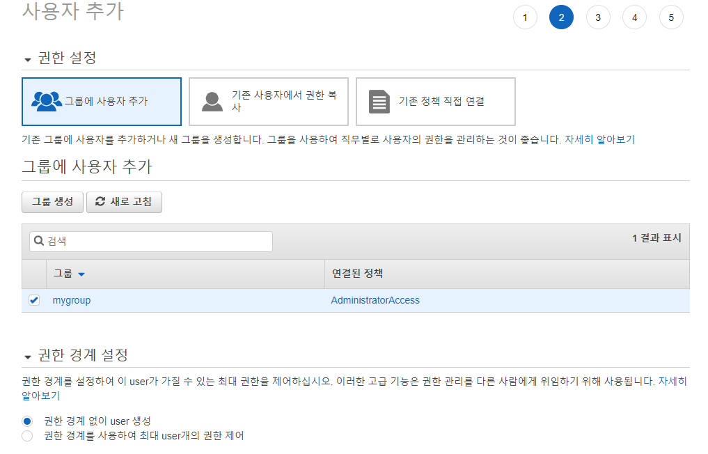 권한 정책 연결 : AdministratorAccess 입력 후 해당 정책 체크 하여 그룹 생성 (administrator 권한 부여)