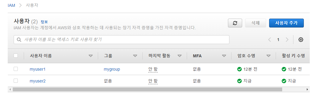 myuser1과 myuser2의 사용자 ARN을 저장해둔다.