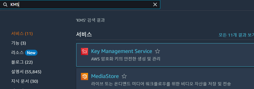 다음과 같이 KMS를 입력하여 Key Managerment Service로 진입한다.