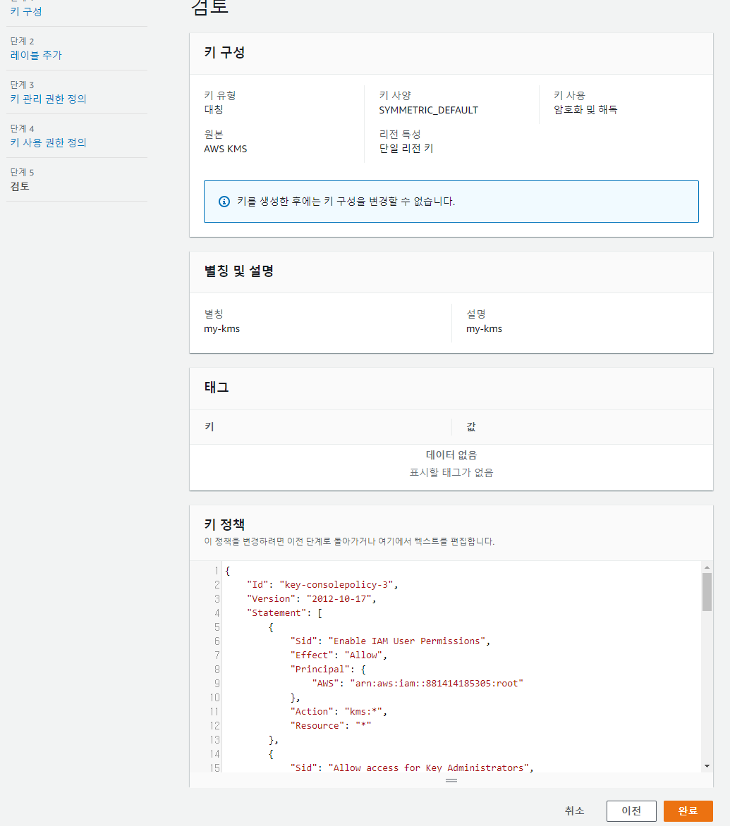 ✔ symmetric를 선택했기 때문에 AWS 계정으로만 KMS에 접근이 가능, 만약 다른 곳에서 AWS kms 에 접근하고 싶다면 Asymmetric를 사용하자.