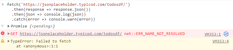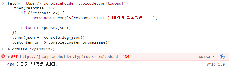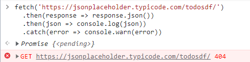 아예 fetch의 요청이 실패되거나 하는 상황에서만 error를 잡을 수 있다. (조금 더 눈에 띄라고 error를 console.warn로 작성했다.)