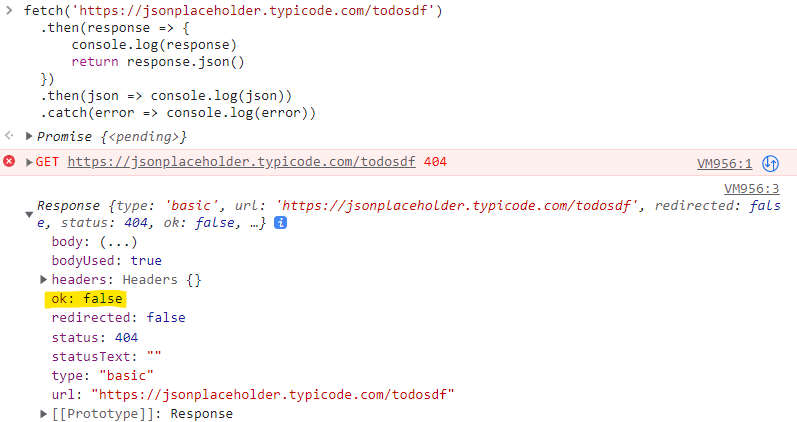 fetch()로 부터 반환되는 Promise 객체는 HTTP error 상태를 reject하지 않습니다. HTTP Statue Code가 404나 500을 반환하더라도요. 대신 ok 상태가 false인 resolve가 반환되며, 네트워크 장애나 요청이 완료되지 못한 상태에는 reject가 반환됩니다. ㅡ MDN